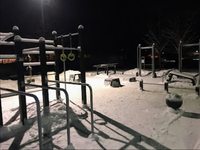 Utegym beläget vid Varpan och Kålgården. Möjlighet för chins och dips samt ringar för den som gillar sånt. Två skivstänger med vikter på ca 30-40 kg. Belysning finns vilket möjliggör användning dygnet runt.